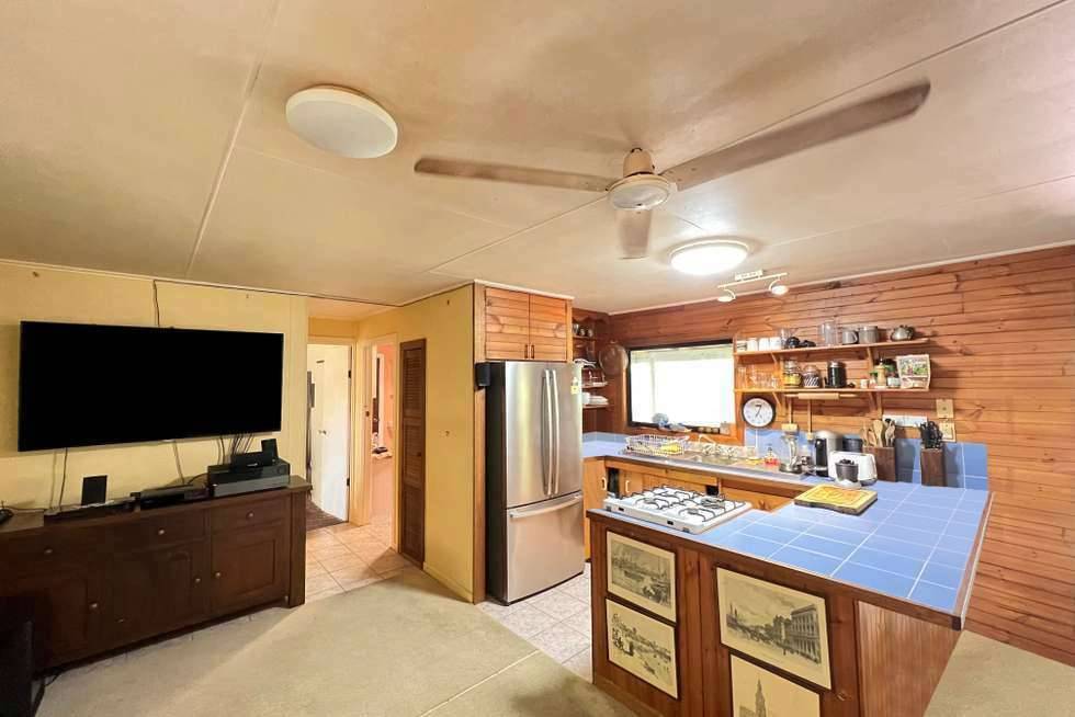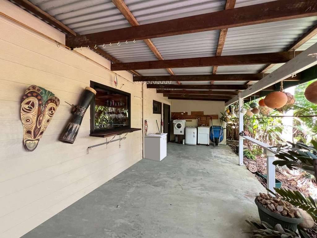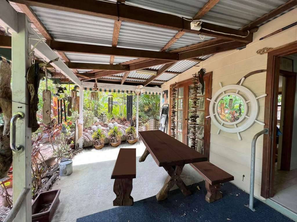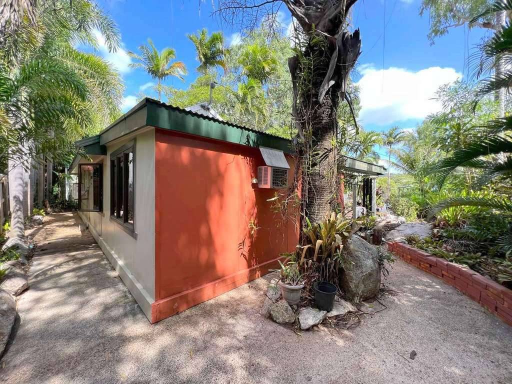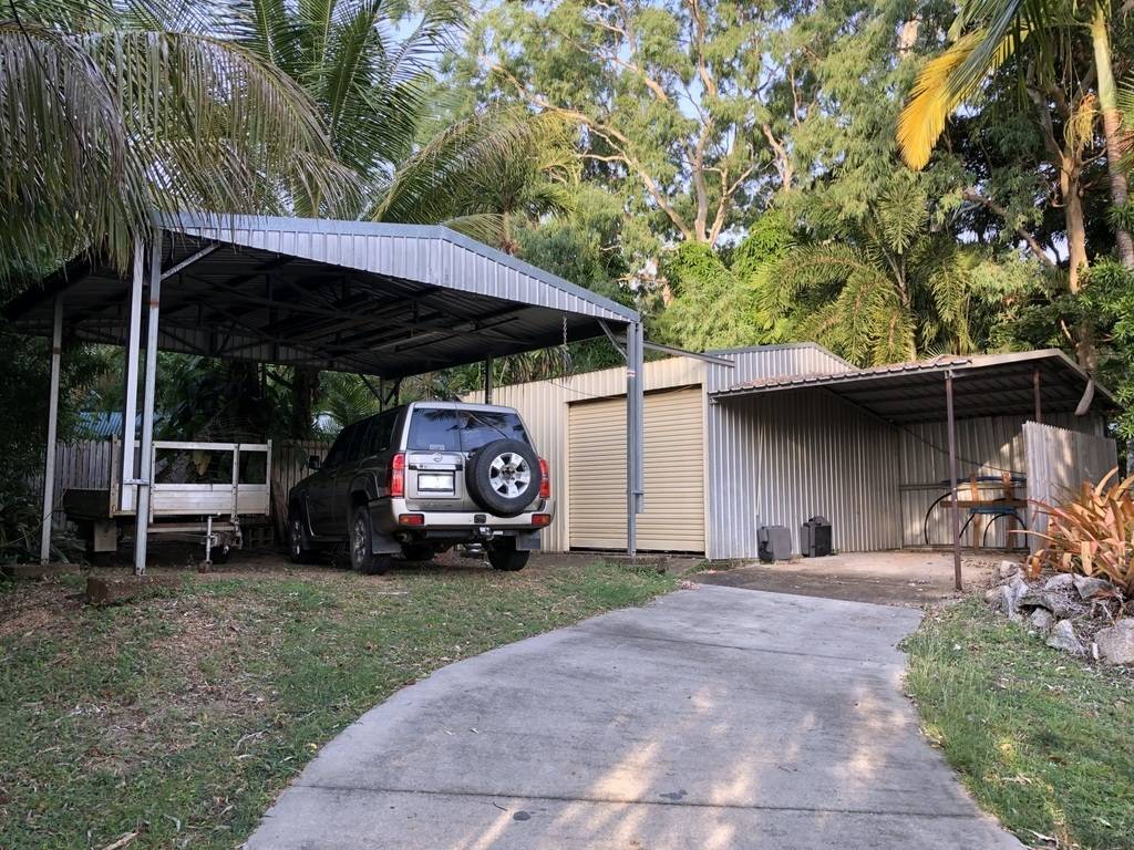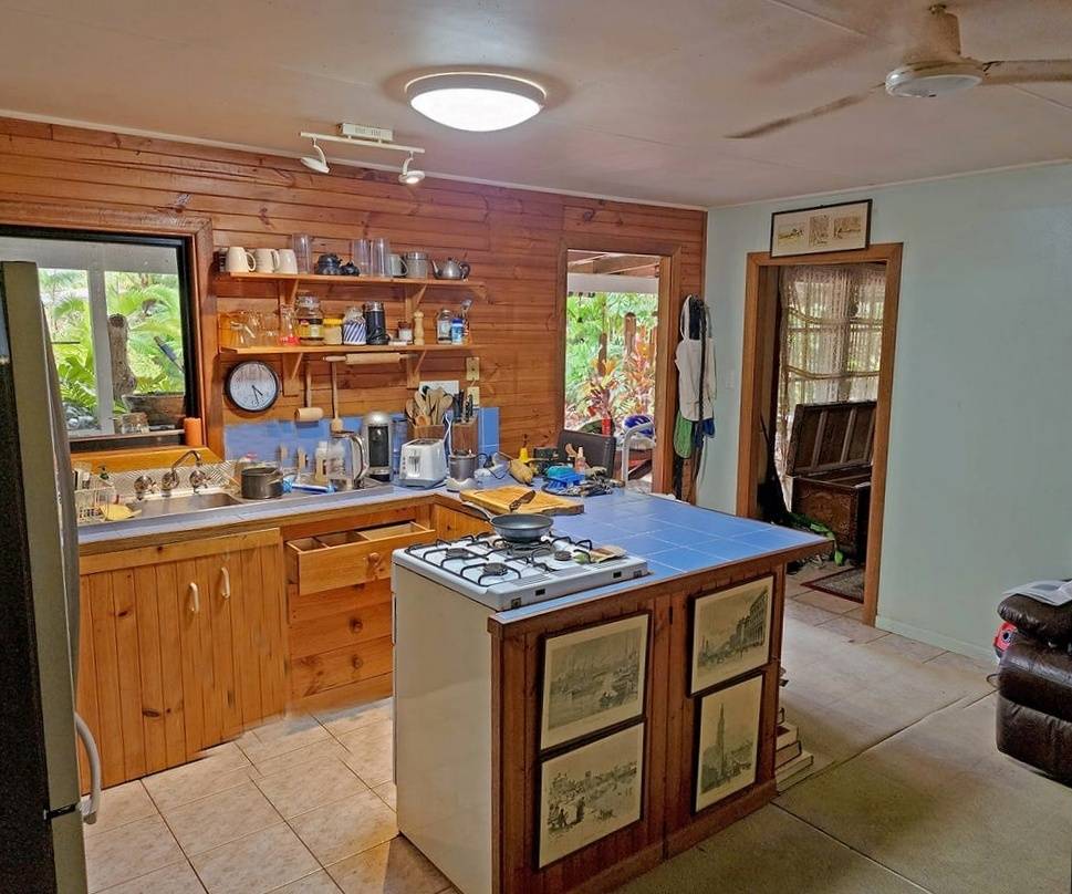 This hidden gem offers a tranquil lifestyle nestled amidst lush tropical gardens that create a serene ambiance. The charming 2 bedroom, 1 bathroom house is set at the back of the 1,012m2 block in a quiet family-oriented neighbourhood on the outskirts of Cooktown. Step inside to find an open plan living area and kitchen with timber panelling, creating a warm and inviting atmosphere. The large main bedroom, with ample space and natural light, opens onto the full-length front patio through elegant French doors. The recently remodelled combined bathroom and toilet with lead light feature door is spacious and opens onto the external laundry one side and the side yard on the other. Outside the paved front courtyard is ideal for outdoor relaxation and entertainment. With a large colourbond garage/workshop and 3 carports, storage and parking are a breeze. A curved concrete drive ensures easy access and convenience. Don’t miss the opportunity to own this little piece of paradise with its blend of privacy, functionality and natural beauty!.