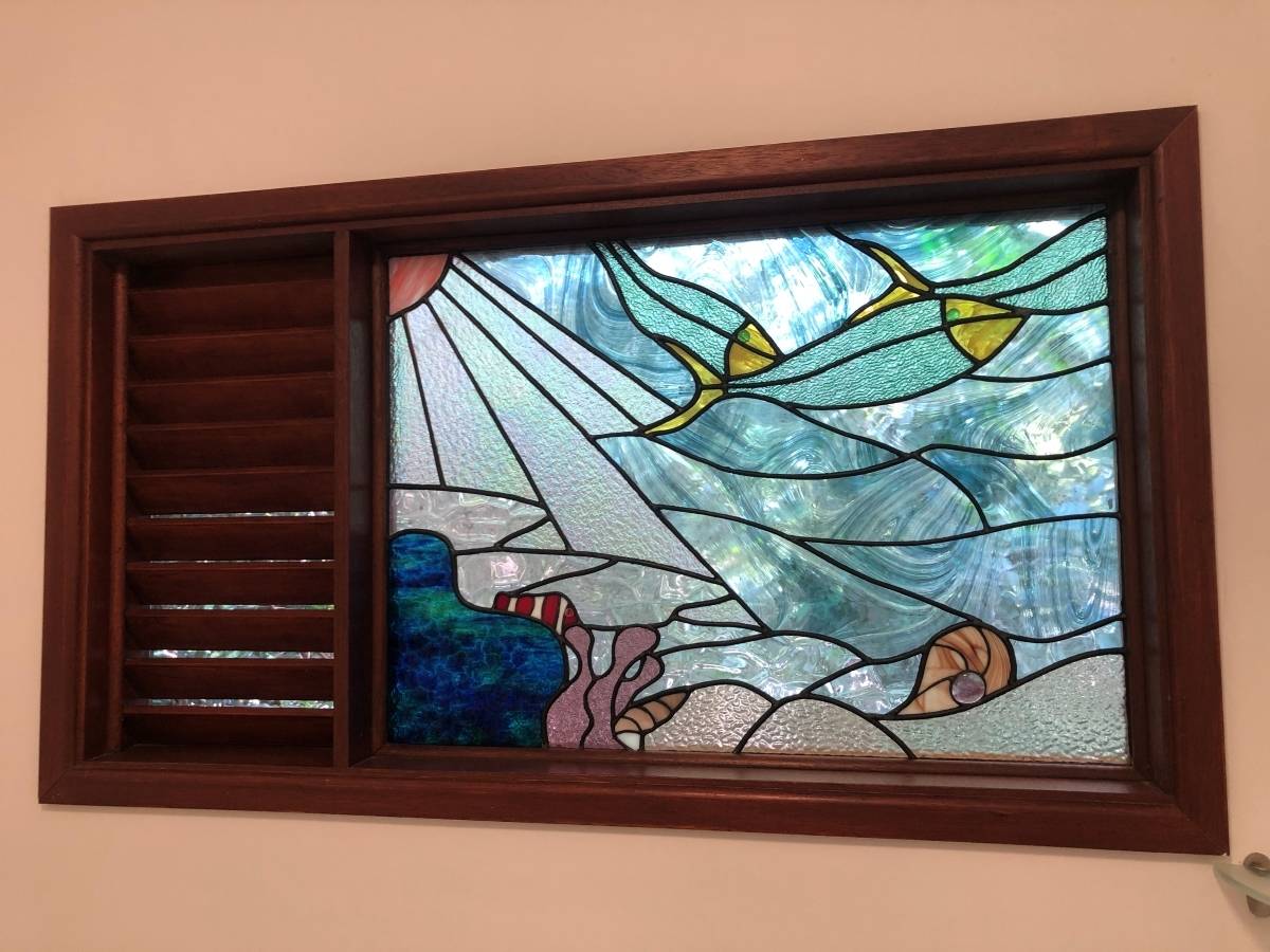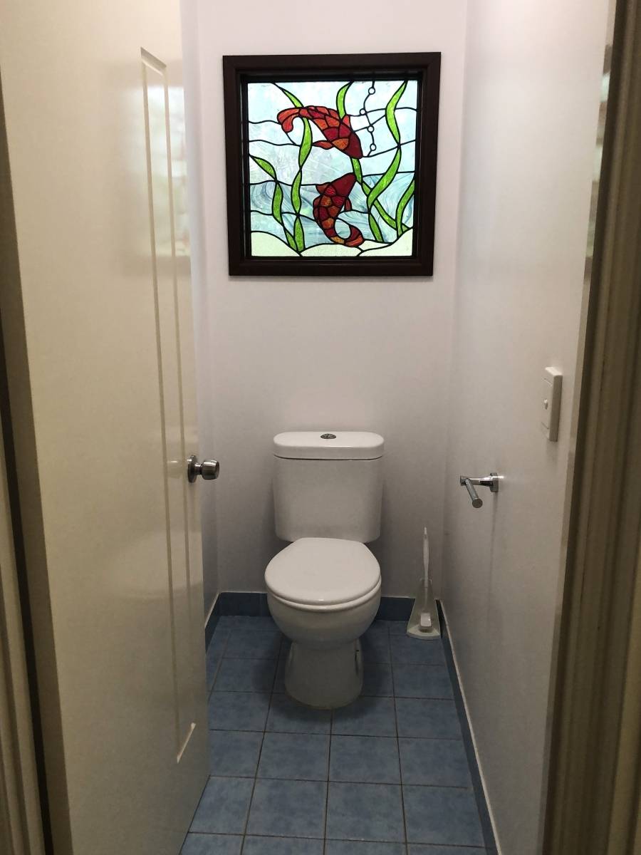 The modern kitchen is well-equipped with an island bench and sink, dishwasher, pantry, and overhead cupboards. Bedrooms are carpeted and include mirrored built-in wardrobes, while charming leadlight feature windows add character throughout.