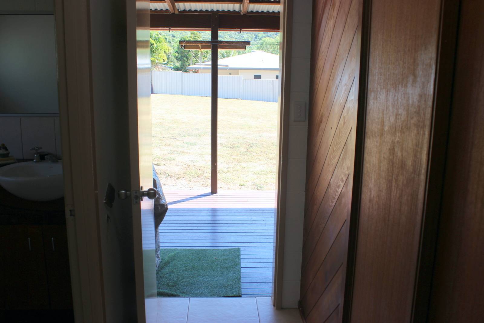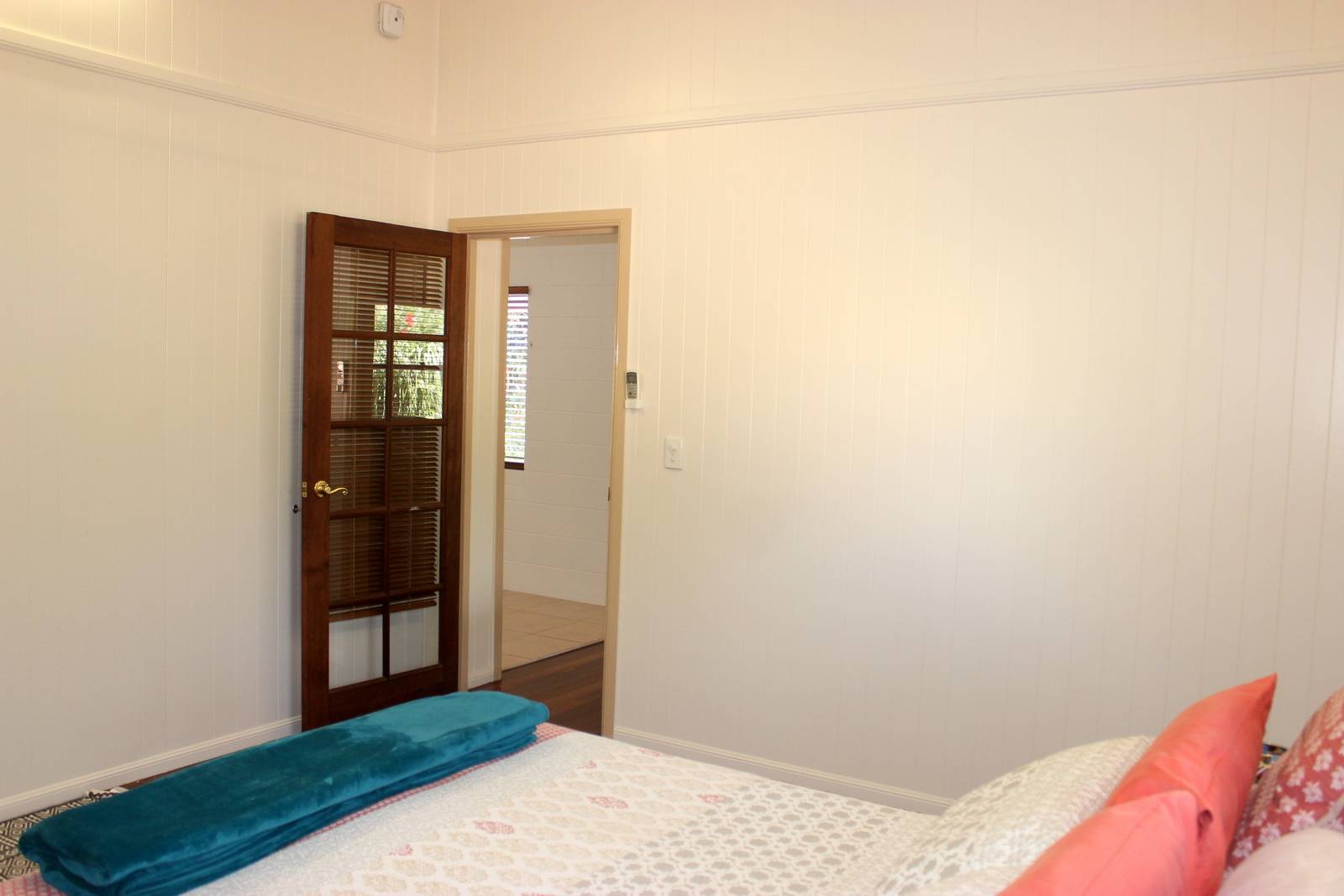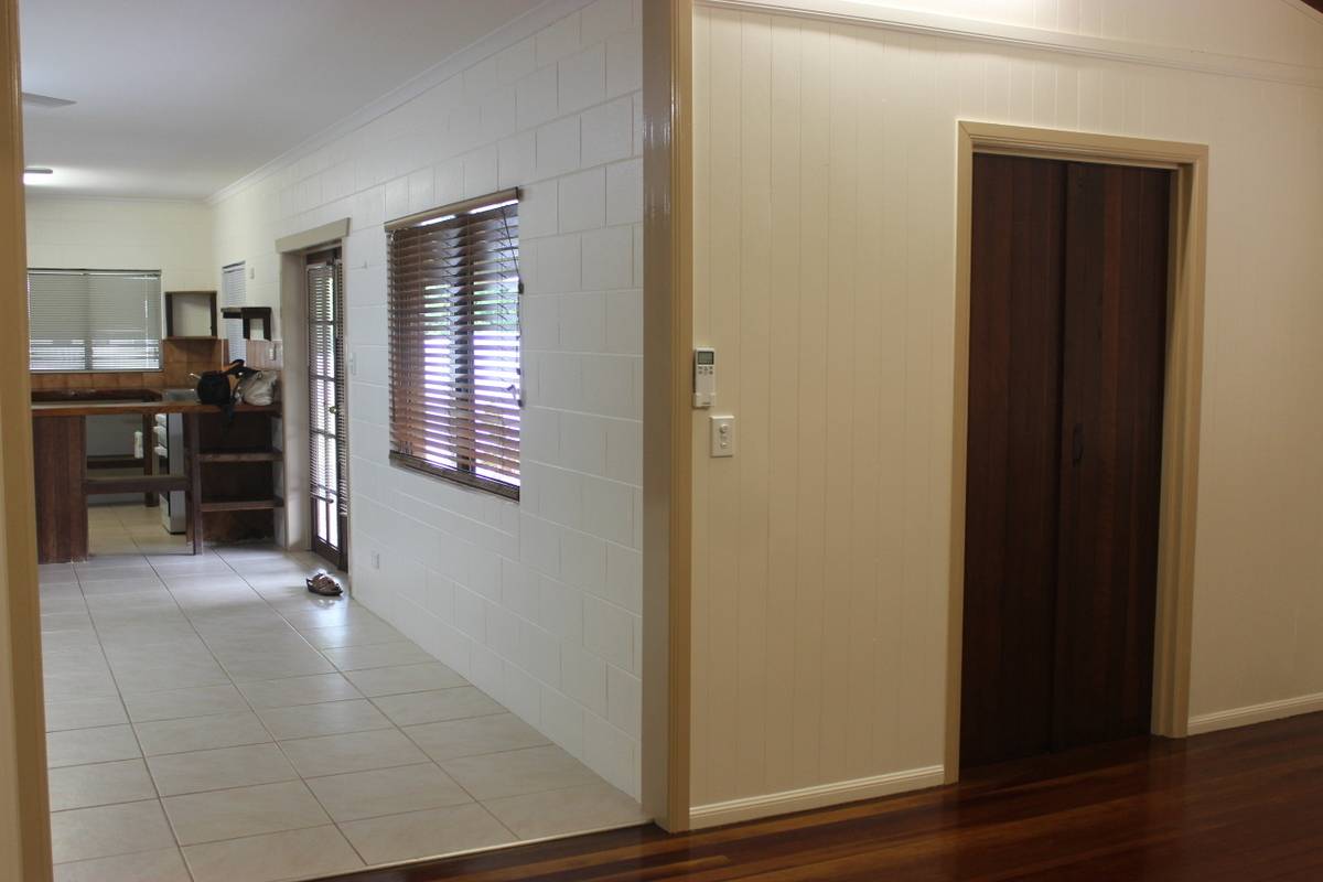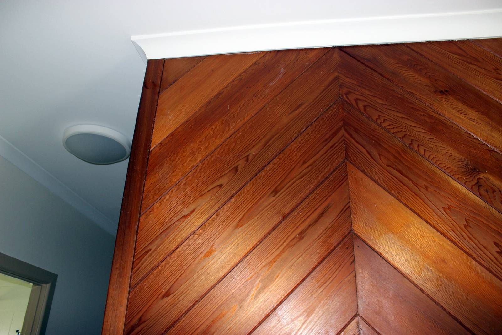 Decorative timber panelling in kitchen and hallway to back veranda doorway