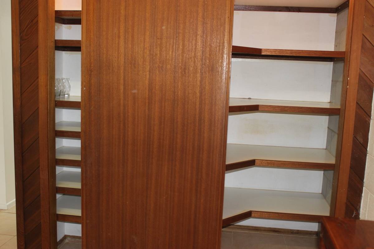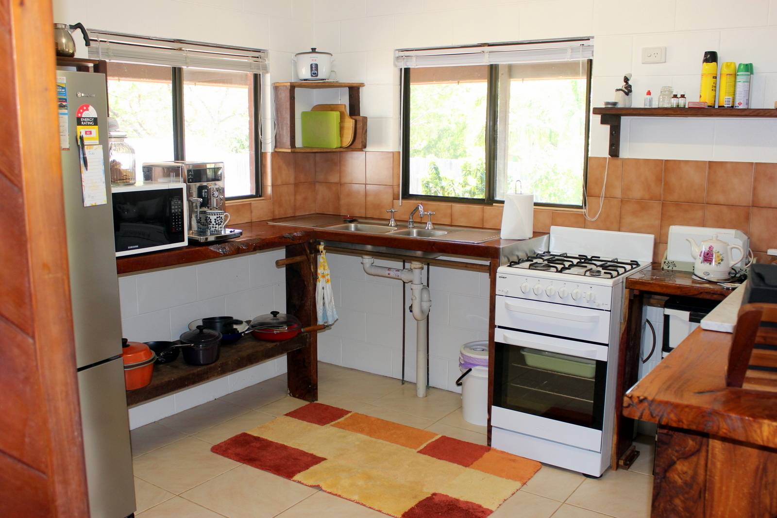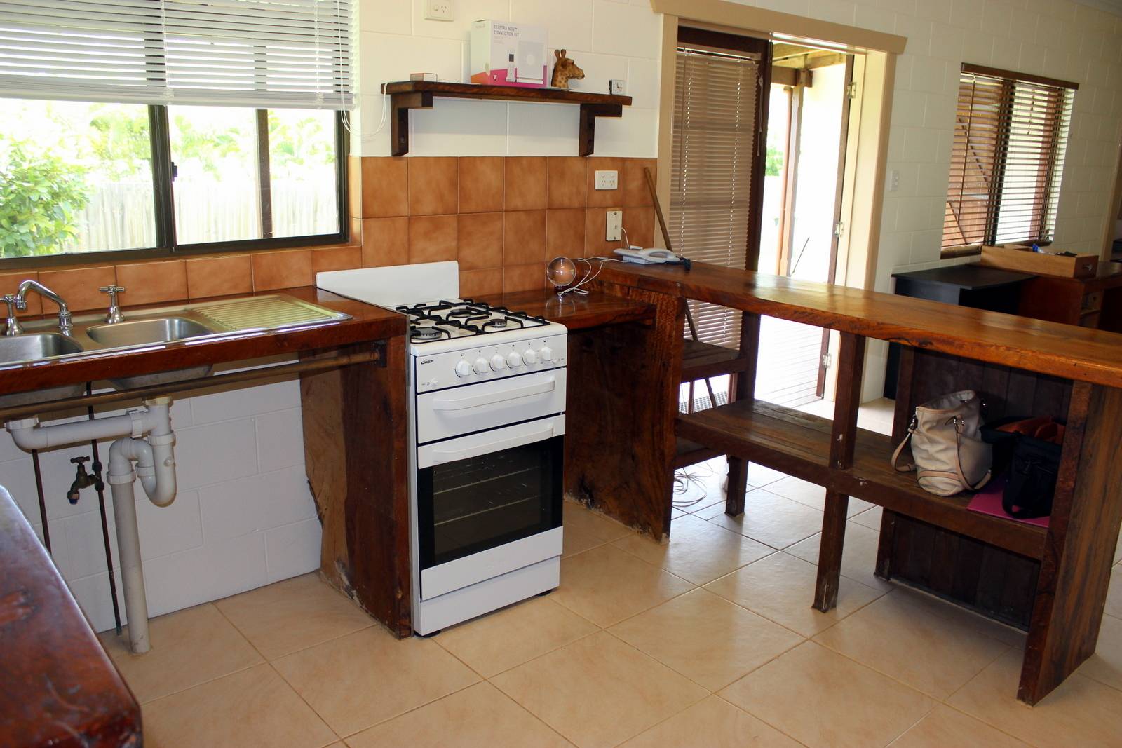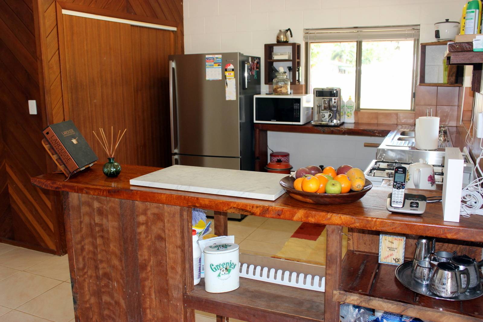 Decorative timber panelling in kitchen and hallway to back veranda doorway